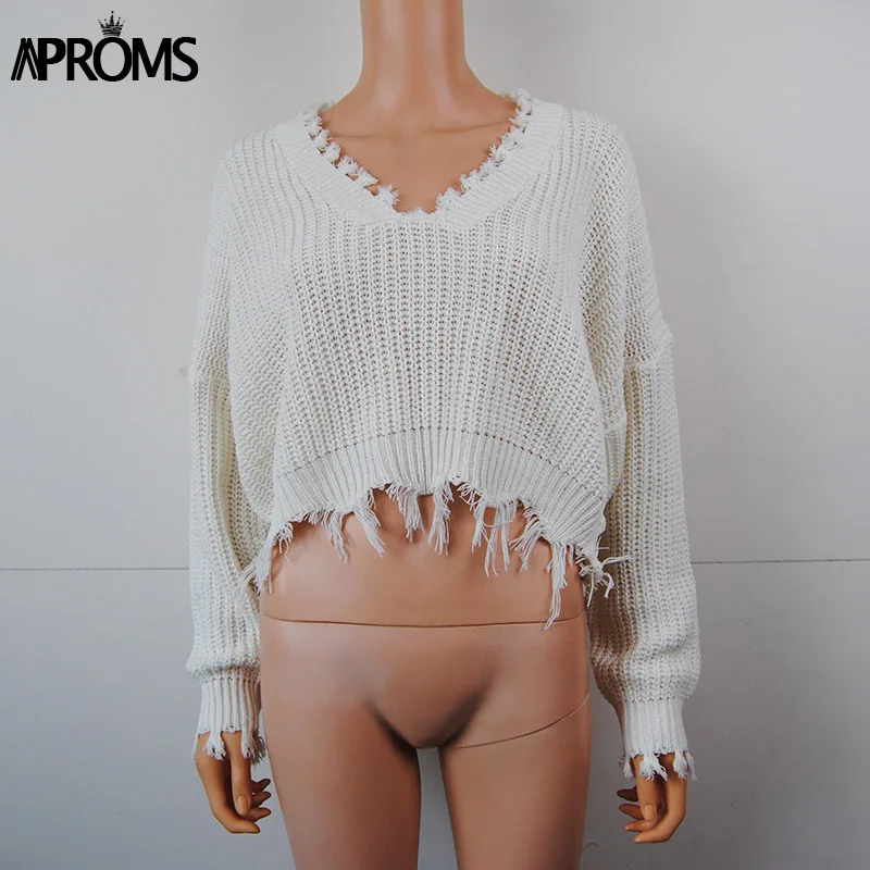 Aproms Tassel głębokie V dziergany sweter kobiet jesień zima biały z długim rękawem dzianiny szydełkowe swetry kobiety przycięte